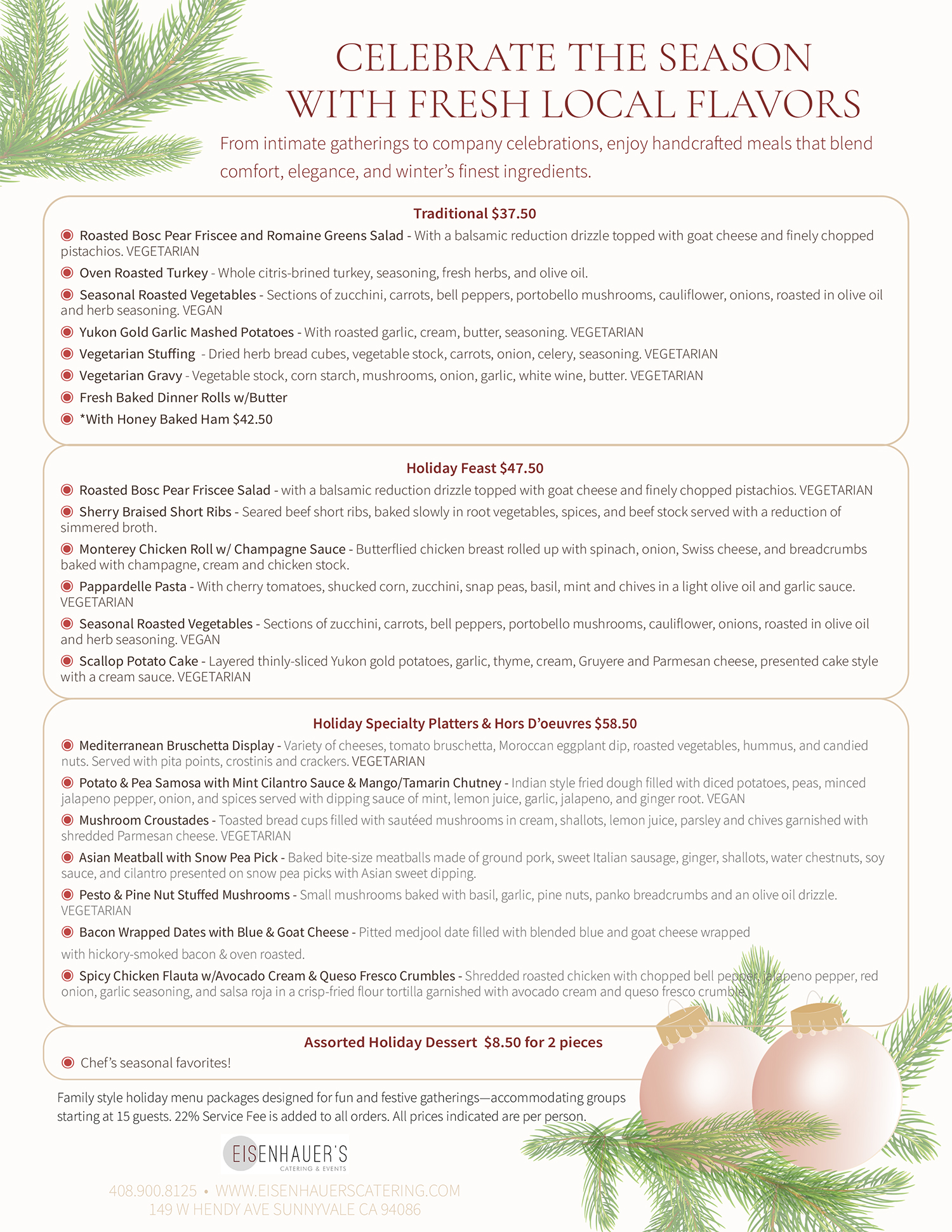 Family style holiday menu packages designed for fun and festive gatherings -- accommodating groups starting at 15 guests. 22% service fee is added is added to all orders. All prices indicated are per person.